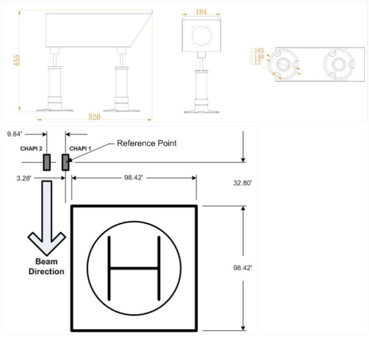 The recommended location for installing the CHAPI Light is shown in above picture. The size of the helipad is dependent on your location and the maximum rotor diameter. The 3.28 foot dimension listed is important to help locate the CHAPI nearest the helipad and assist helicopter pilots. After the elevation and exact physical location of the light boxes, then mount the light boxes on the pads.